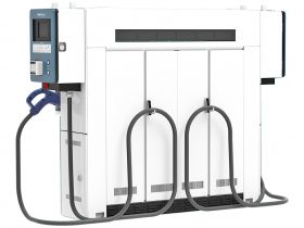 新電元工業はこのほど、最大出力60kWのEV用急速充電器SDQC2F60シリーズ、「SDQC2F60UT3210‐M」の販売を開始すると発表した。マルチアウトレット方式による2台充電で、独立した操作パネルが両側面に設けられ、パワーシェアにより同時充電できる。 -
