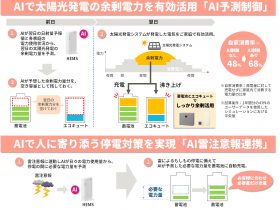 クラウド上のAIが利用者の生活パターンなどを学習し、卒FITを迎える太陽光発電ユーザーの発電余剰電力の予測制御や、雷による停電に備えた自動充電機能など、利用者の様々な生活シーンに合わせた充放電制御を提供する。 -