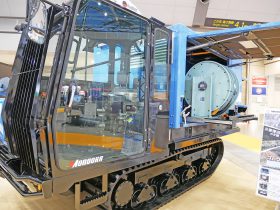 ゴムクローラ式移動電源車・試作機発表【諸岡】高い走破性、100kVA自家発電装置+送電ケーブル装備