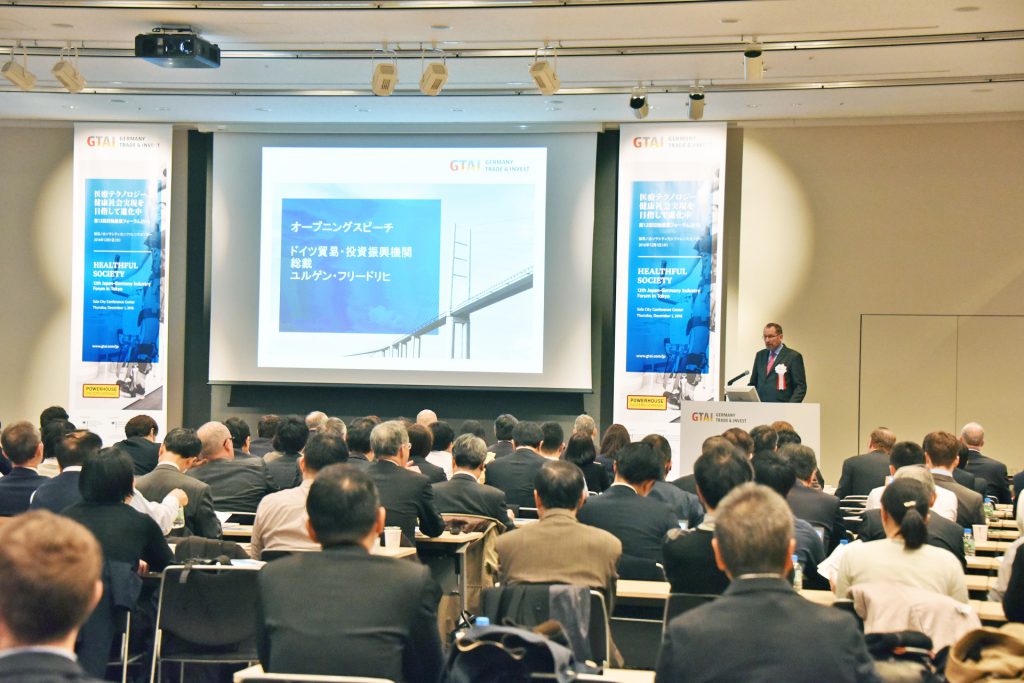 ドイツ貿易・投資振興機関(GTAI)主催で [画像・上:昨年の「日独産業フォーラム」会場の様子。オープニングスピーチを行うGTAI総裁ユルゲン・フリードリヒ氏] ドイツ貿易・投資振興機関(GTAI)は、ドイツの連邦政府が設立した機関。経済エネルギー省(BMWi)の後援を受けて、ドイツ国内の企業の海外進出のサポート、及び国外企業のドイツ国内市場進出のサポートなどを行っている。 本部はベ…