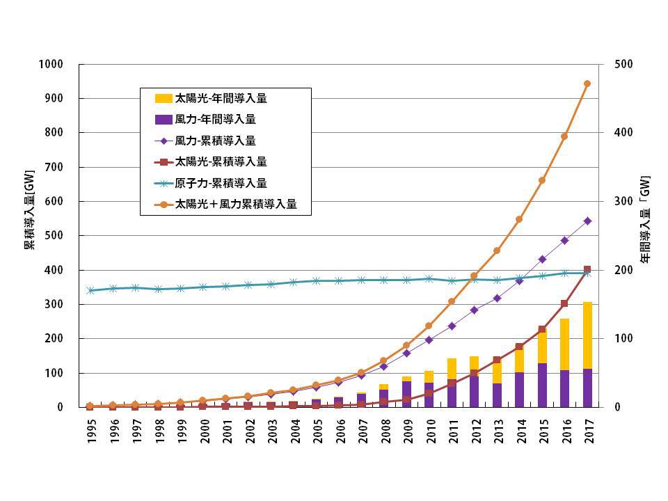 ①太陽光が原発の累積設備容量に匹敵 世界中で自然エネルギー市場が発展するなか、これまで自然エネルギーとして主力となってきた水力発電や風力発電に続き、太陽光発電の導入が世界各国で飛躍的に進んでいます。 BNEF(Bloomberg New Energy Finance)による最新の2017年の速報データ*1では、世界全体の太陽光発電の年間導入量は、過去最大の約1億kW近くに達しました。10年…