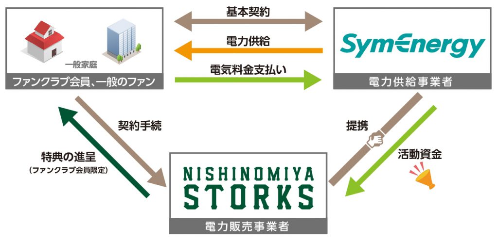 サービス名称を「NISHINOMIYA STORKS ハッピーエナジー」とし、サービスに契約者の電気料金の一部が西宮ストークスの活動資金となる仕組み。