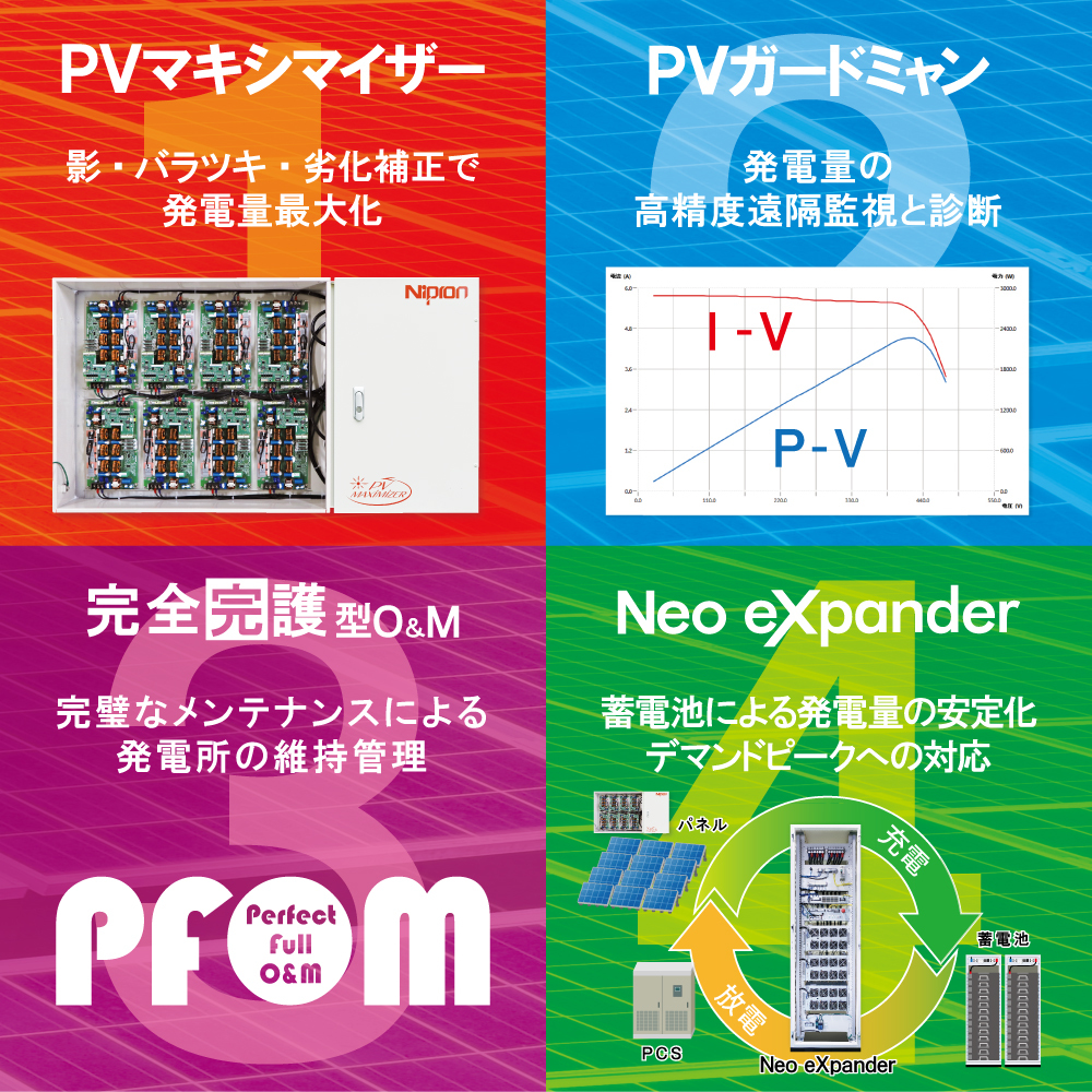 発電所の発電量をストリング単位で最適制御を行うことで最大化する「PVマキシマイザー」、ストリング毎のI-V特性を365日、毎日一斉に自動測定でき、異常パネルを早期発見することができる高精度遠隔監視「PVガードミャン」、蓄電システム向けの双方向DC/DCコンバータ「Neo eXpander(ネオエキスパンダー)」、さらに発電所のメンテナンスフリーを実現する完全完護型O&M「PFOM(パフォーム)」を、「4大ソリューション」として提案する。