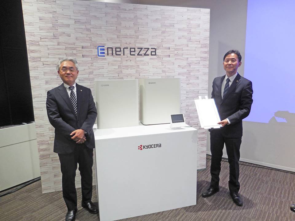 京セラはこのほど、世界初となるクレイ型リチウムイオン二次電池(LiB)の開発に成功し、この蓄電池を内蔵した住宅用定置型蓄電システム「Enerezza(エネレッツァ)」を発表した。来年1月以降に少数限定での販売を開始し、本格量産開始は2020年秋を予定。 [画像・上:Enerezzaをお披露目した京セラ ソーラーエネルギー事業本部副本部長・小谷野俊秀氏(左)と、同 研究開発本部エネルギーシス…
