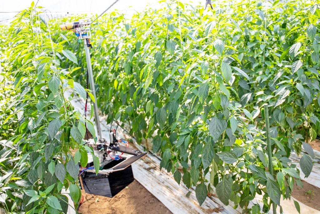 [画像・上:自動収穫ロボットの事例。ピーマンを収穫している(提供:JXTGホールディングス)]