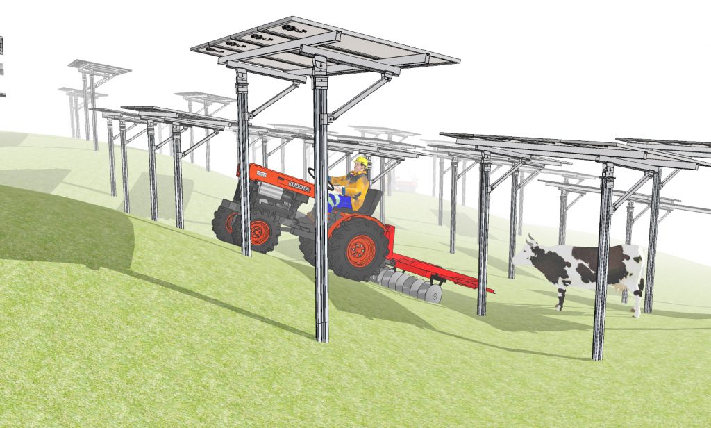 この長い支柱2本にパネル4枚を搭載(横幅4m)して1ユニットとする。支柱の高さとユニットの横幅は、発電事業者の要望によって設計段階で変更も可能だ。そしてユニットを複数並べて発電所とする、柔軟な架台設置ができる設定にしている。この仕様によって、傾斜地にある果樹園や牧草地にも設置が可能になった。藤棚式では存在していた、農業機械の入ることができないデッドスペースを無くす配置も可能だ。