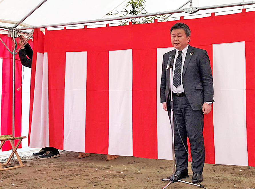 [画像・上:地鎮祭で挨拶する増田裕一郎代表取締役社長]