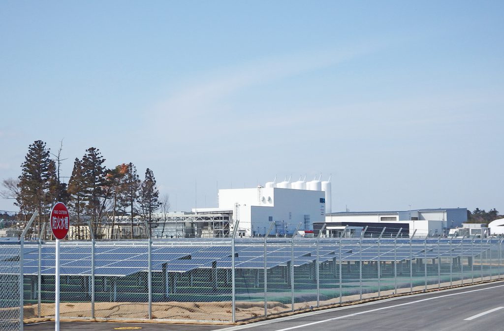 [画像・上:3月に福島県浪江町で開所した大規模再エネ水素製造施設「福島水素エネルギー研究フィールド(Fukushima Hydrogen Energy Research Field (FH2R))」。20MWの太陽光発電から得た再エネ電力で水電解するが、その太陽光パネルにはアンフィニ・福島工場(福島県楢葉町)で製造した「Made in 福島」のパネルも一部で導入されている]