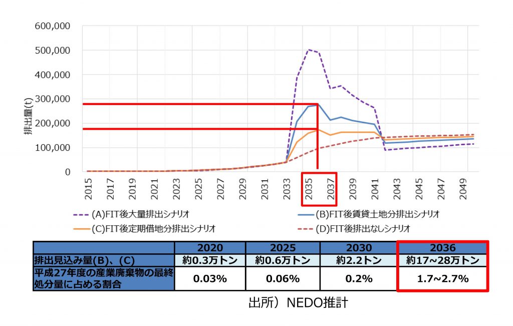 導入初期段階の設備が既に使用済となりつつあり、排出が始まっている。また、リプレイスや故障、自然災害による被災により、本来の寿命を待たずに廃棄される太陽光パネルの排出量も増加している。新エネルギー・産業技術総合開発機構(NEDO)の調査によれば、2036年に約17万~28万トンほどのパネルが廃棄されると予測されている。