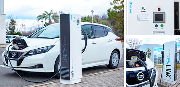 「eLINK」は、充電だけでなく、電気自動車の蓄電池から電力を取り込み、公共施設やビル等へ供給できる。EMSの指令受信後、約2秒で定格電力まで出力が可能。また、電気自動車に蓄えた電気を直接送配電網に送るV2Gにも対応し、VPPリソースとして、国内の実証実験にも多数採用されている。