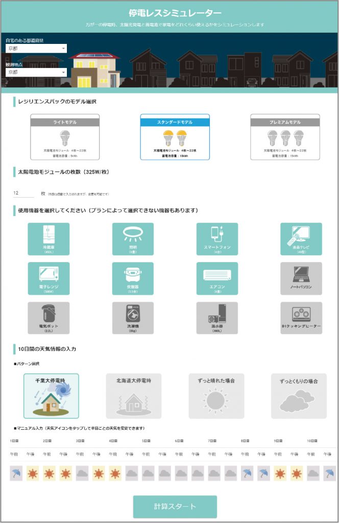 エクソル(京都市中京区)はこのほど、太陽光発電システムと蓄電池の設置で、停電期間中に電気製品が、いつ、どのくらい使えるか分かる「停電レスシミュレーター」を、同社のウェブサイトで公開した。 [画像・上:停電レスシミュレーター] 停電レスシミュレーターは、停電期間を10日間と想定。電気の契約プランや屋根の大きさなどの入力は不要で、居住地や停電時に使用したい機器などを選ぶだけで、選択機器が…