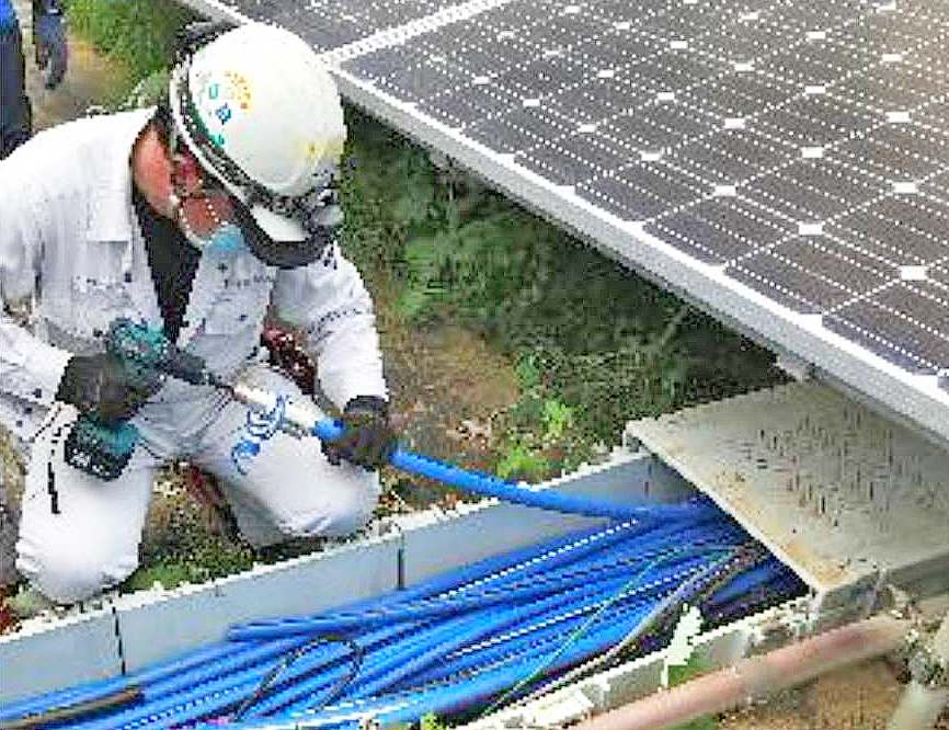 古河電気工業(東京都千代田区)とSFCC(神奈川県川崎市、電線製造・販売の合弁会社として古河電工と昭和電線ホールディングスにより2019年8月に設立)はこのほど、高機能型低圧アルミ導体CVケーブル「らくらくアルミケーブル™」が、山梨県のメガソーラー発電所に採用されたと発表した。近年多発する銅線の盗難に対する防止策として、有効性が期待されている。 [画像・上:トラフ内での処理作…