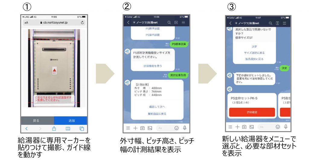 ノーリツ(神戸市中央区)は、給湯器の施工・メンテナンス事業者向けに同社が提供しているB to BのLINE公式アカウント「ノーリツ/お湯net(ネット)」にスマートフォンの画像測定技術を用いた新機能を搭載した。 [画像・上:「PS部材計測機能」の操作手順(提供:ノーリツ)] 施工事業者が顧客から給湯器の取り換えに関する問い合わせを受けた際には、給湯号数・設置形態など様々存在する確認項…