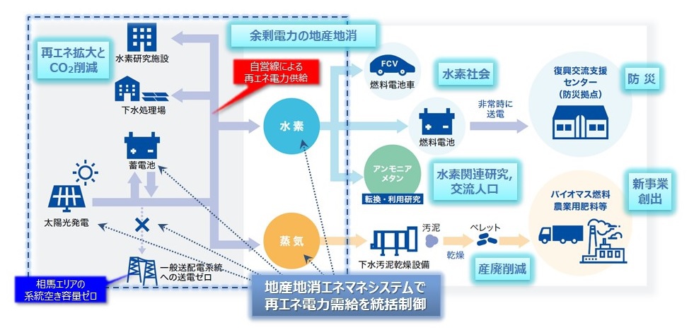 余剰電力は下水汚泥の乾燥システム、蓄電池への充電、水素製造などに利用され、また製造した水素は非常時に燃料電池の燃料に使用し、地域の防災拠点に専用配線で送電できる仕組みを整えている。