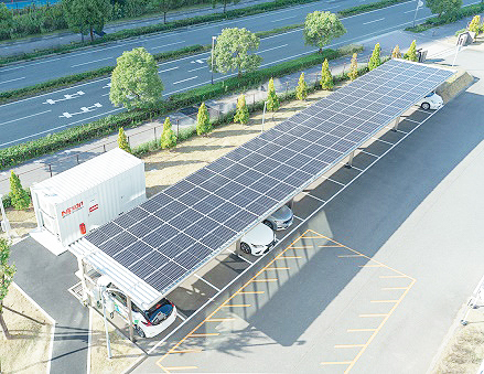 [画像・上:太陽光発電100%で電気自動車を走らせる自家消費型ソーラーカーポート]