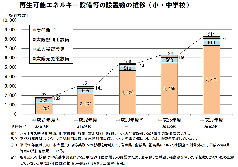 文部科学省は毎年、公立学校施設における再生可能エネルギー設備等の設置状況を把握し、地球温暖化対策の取組を推進することを目的として「再生可能エネルギー設備等の設置状況」の調査を実施している。2015年度の調査結果によれば、2015年4月1日現在、公立の小・中学校における太陽光発電設備の設置率は2014年度の17.8%から24.6%に増加した。 全国の公立学校施設(幼稚園、小学校、中学校、高等学…