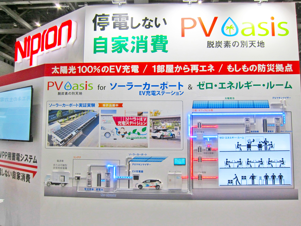 ニプロンは、脱炭素社会の実現やレジリエンス強化に貢献する非連系タイプ蓄電式PV自家消費システム「PV Oasis」のソリューションとして、「ソーラーカーポートEV充電ステーション」と「ゼロ・エネルギー・ルーム」を紹介する。