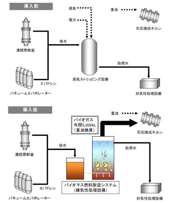 大王製紙はこのほど、三島工場(愛媛県四国中央市)の石灰焼成キルン(クラフトパルプ製造工程で使用する石灰を焼成して再利用する設備)において、バイオガス、天然ガスと重油の混焼を実現したと発表した。 [画像・上:製紙排水を利用したバイオ燃料製造システム導入イメージ(提供:住友重機工業)] 同設備は、住友重機械工業100%子会社の住友重機械エンバイロメントの嫌気性処理システム(バイオインパク…