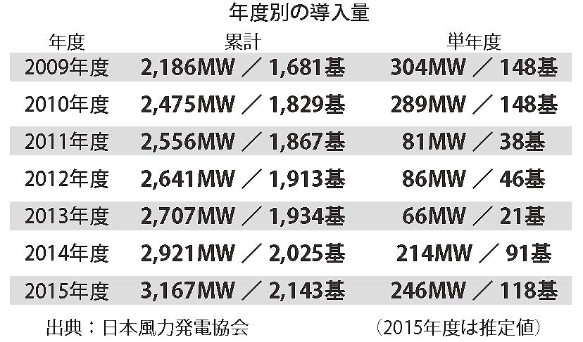 日本風力発電協会(JWPA)は1月21日、2015年12月末の風力発電導入実績と2015年度末(2016年3月末)の推定導入量を発表した。これによれば、2015年12月の累積導入量は303.8万kW(2,077基、434発電所)、2015年(1月~12月)の単年導入量は24.4万kW(109基、22発電所)だった。2005年の累計導入105万kWの約3倍の伸びを示している。 2015年の導入…