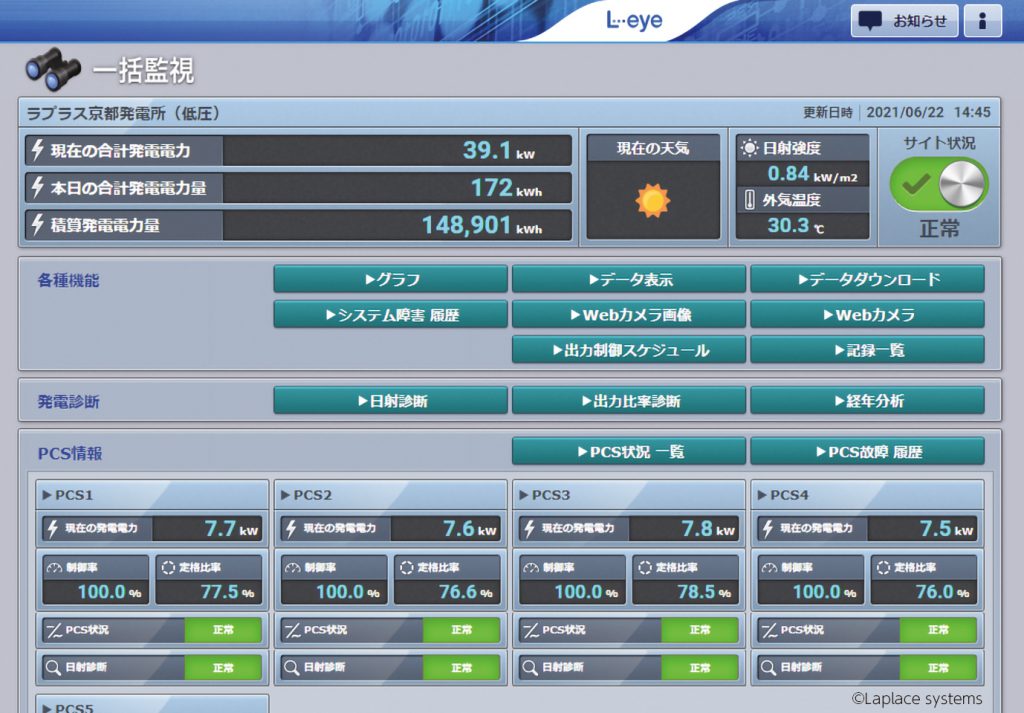 同社は、遠隔監視システム&サービスL・eyeをメインとしたモニタリングで、太陽光発電分野を中心にシステム容量14GW/6万3,000件の導入実績を誇る。L・eyeはPCS毎の高機能監視と出力制御をまとめて実現する。そのL・eyeをイニシャルコスト0円で導入できる月額プランでは高圧3(500kW以上1MW未満)と高圧4(1MW以上2MW未満)を新しく追加し、対応範囲を拡大した。出力制御の対応実績は1万3,500件となり、ブースでは電力会社から制御スケジュールを取得して自動で制御するスケジュール制御や、旧ルールで遠隔監視画面からPCSのオン/オフ制御ができるオンライン制御機能も紹介する。