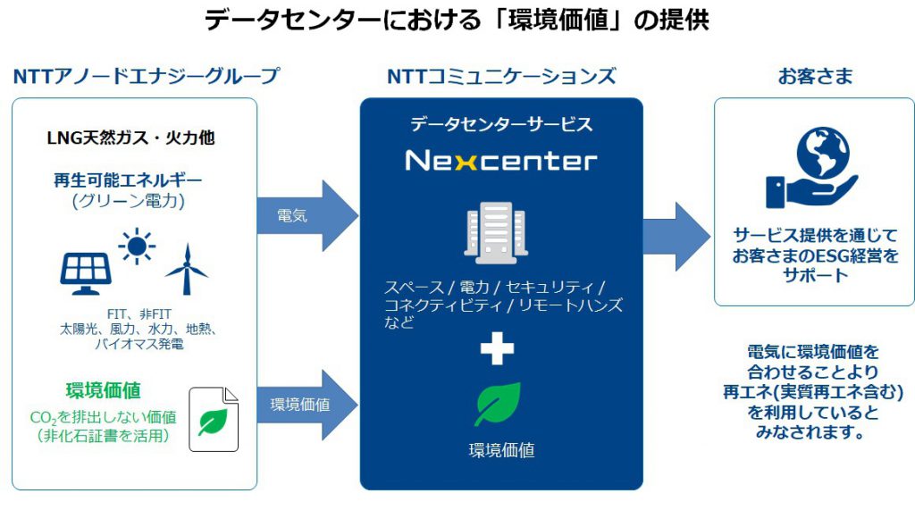 NTTコミュニケーションズ(東京都千代田区)はこのほど、NTTアノードエナジー(東京都千代田区、NTT-AE)と連携し、同社のデータセンターを利用する企業に向け、再生可能エネルギーを選択できる電力メニューの提供を開始すると発表した。NTT-AEとNTT-AEグループのエネット(東京都港区)から供給を受ける。 [画像・上:データセンターにおける「環境価値」の提供イメージ(提供:NTTアノード…