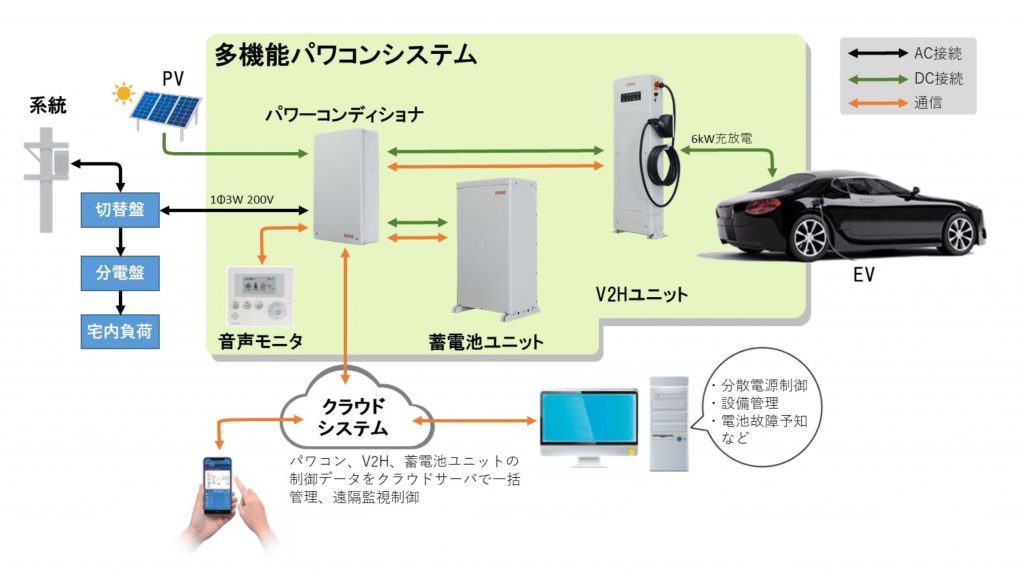 太陽光・EV・蓄電池の「多電源化」で災害に強い電力システムを構築 東京電力ホールディングスと、ダイヤモンドエレクトリックホールディングスの中核企業で電気機器メーカーのダイヤゼブラ電機(大阪市淀川区、2021年10月に田淵電機から商号変更)は、新たな蓄電池ユニット、V2Hユニット、PCSを組み合わせた「多機能パワコンシステム」を共同開発した。 [画像・上:「多機能パワコンシステム」の概…