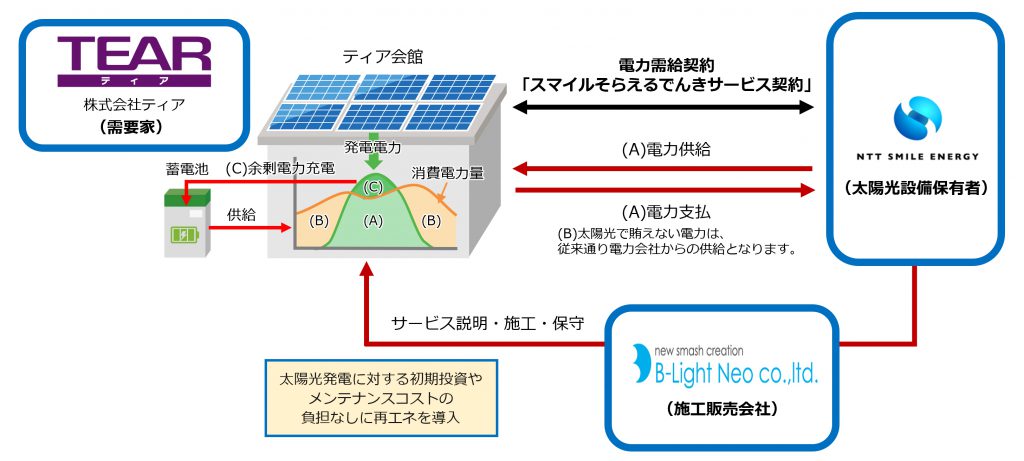 NTTスマイルエナジーは4月、環境負荷低減・災害対策・電気代削減などを目的として、ティア(名古屋市北区)が愛知県内で展開する葬儀場で蓄電池付きオンサイトPPAサービス「スマイルそらえるでんき」の提供を開始した。 [画像・上:ティアに提供した「スマイルそらえるでんき」のスキーム(提供:NTTスマイルエナジー)] サービスを提供するのは、岡崎上地、滝ノ水、津島、如意申、岩塚、弥富、北名古…