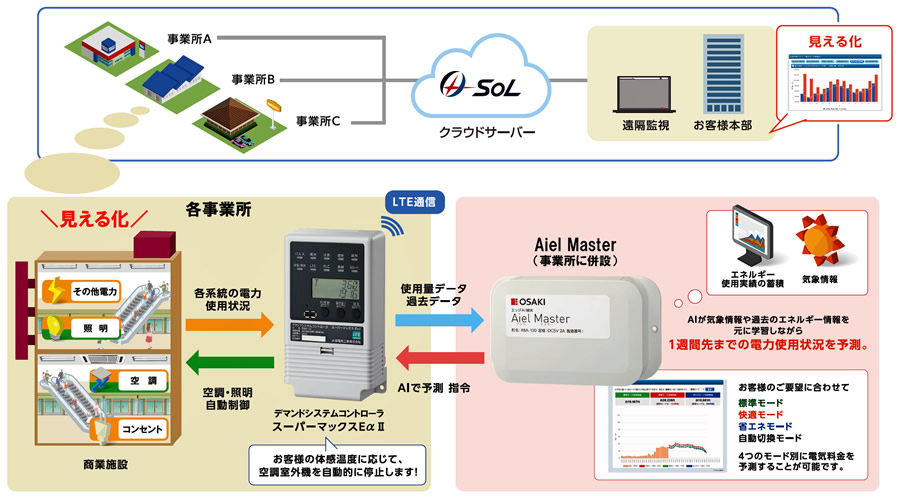 デマンドコントローラ「スーパーマックスEαⅡ」は、施設における設備毎の電力使用量の「見える化」と「空調・照明等の制御」が可能となるエネルギーマネジメントシステムの主装置。光熱費削減だけでなく、PV発電量や蓄電池データなどの可視化により脱炭素に向けた管理マネジメント業務を支援する。
