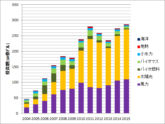 風力発電や太陽光発電などの世界の自然エネルギー市場は、10年ほど前から急成長し、2011年には投資額が2004年と比べて5倍以上の2,800億ドル近くに達していました。2011年からは、太陽光発電の導入コストの低下が急速に進み、欧州などで太陽光発電の市場などが調整局面に入ったため、一旦は市場全体の投資額は減少する傾向にありました。しかし、最近発表されたUNEP(国連環境計画)/BNEF(ブルームバ…