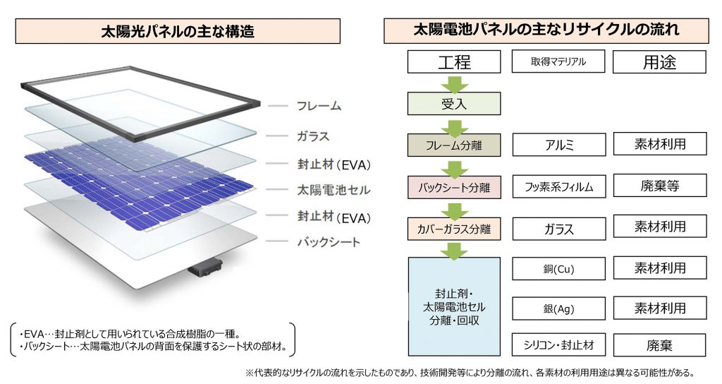 経済産業省・資源エネルギー庁と環境省は4月、太陽光パネル(太陽電池モジュール)をはじめとした再エネ発電設備の廃棄・リサイクルの制度設計を議論する有識者検討会(委員長=髙村ゆかり・東京大学教授)の初会合を開催した。 [画像・上:太陽光パネル(結晶シリコンモジュール)の構成部位例(資料:経産省)] 経産省による今後の太陽光パネル廃棄量の推移予測(資料:経産省) 両省庁によると、太陽…