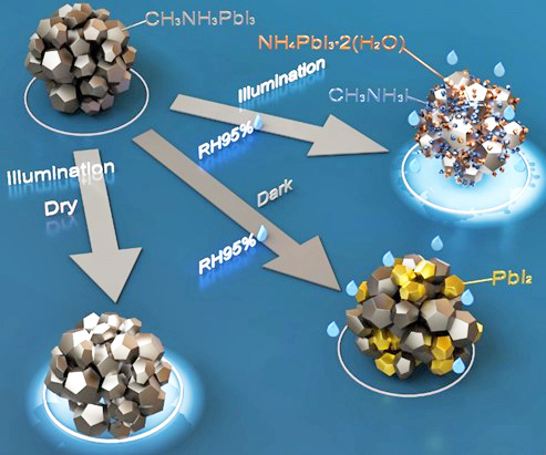 桐蔭学園はこのほど、桐蔭横浜大学(横浜市)と、と高輝度光科学研究センター(JASRI/兵庫県佐用町)が、ペロブスカイト太陽電池における光と湿度の共存環境下での劣化機構を、放射線を用いたX線回折法測定法を用いて世界で初めて解明したと発表した。 [画像・上:本研究の結果から示唆される劣化機構の模式図(提供:桐蔭学園)] ペロブスカイト太陽電池は、ペロブスカイトと呼ばれる結晶構造を持つ化合…