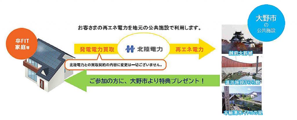 福井県大野市と、地元の旧一般電気事業者である北陸電力(富山市)は7月7日、再生可能エネルギー固定価格買取制度(FIT)期間満了後の電力(卒FIT電力)を活用し、大野市の公共施設へ再エネ電力を供給する取組みを開始した。 [画像・上:取組みのスキーム図(提供:北陸電力)] 両者は今年5月に締結した「脱炭素社会実現に向けた連携協定」に基づき、大野市内でつくられた再エネ電力を同市内の「越前大…