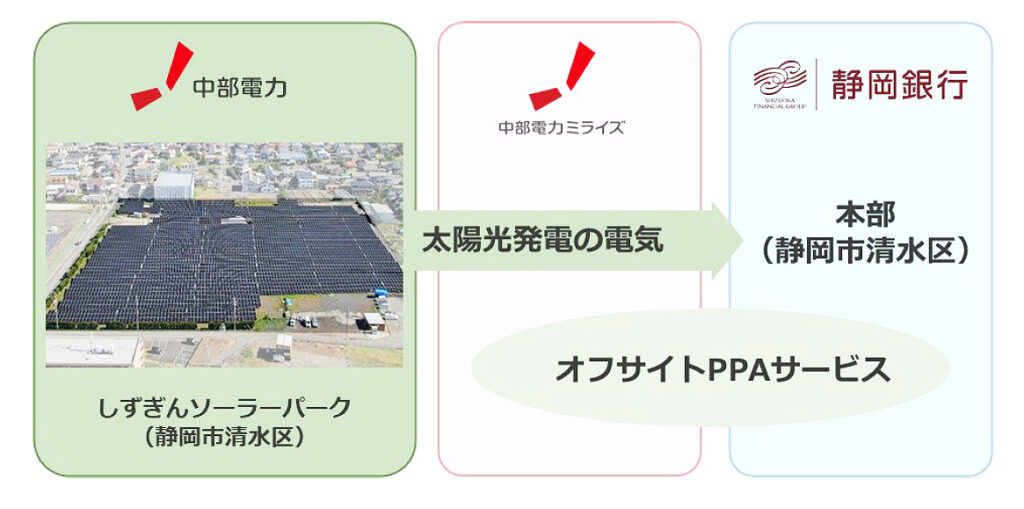 中部電力と中部電力ミライズは10月31日、静岡銀行本部(静岡市)へオフサイトPPA(電力購入契約)サービスによる電力供給を開始したと発表した。 [画像・上:オフサイトPPAサービスの概要(提供:中部電力)] 中部電力グループ所有地内に建設した同行専用太陽光発電所「しずぎんソーラーパーク」(静岡市)が9月26日に営業運転を開始。これを活用したオフサイトPPAサービスとなる。同発電所の保…