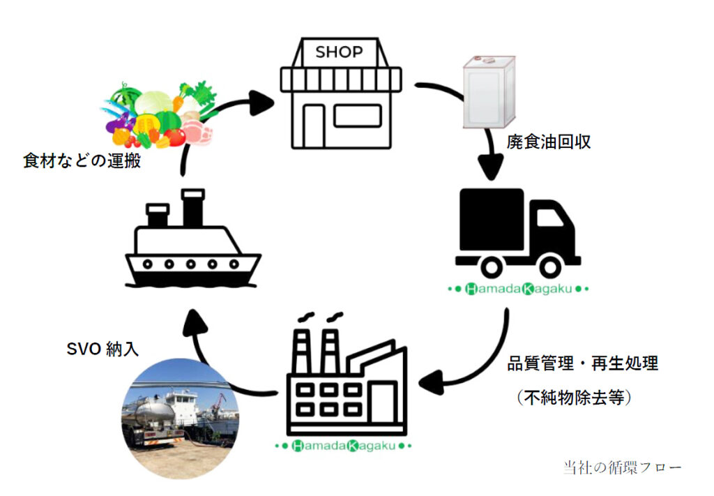 廃食油リサイクル事業を行う浜田化学(兵庫県尼崎市)は、廃食油を、燃料である重油に直接混合したバイオ燃料を用いた船舶運航の海上実証実験に成功した。 [画像・上:SVOによる資源循環のイメージ(提供:浜田化学)] 本実験は国土交通省による2023年度「船舶におけるバイオ燃料の利用に関する調査事業」の一環として行われた。現役の内航船2隻を対象に、通常使用されている舶用燃料のLSC重油にSt…
