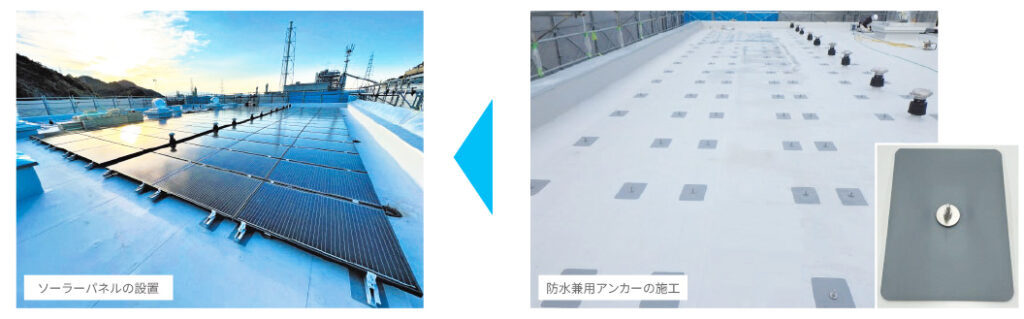 住友化学の関連会社(住友化学が非過半の筆頭株主)で樹脂加工・化学加工の事業を行う住友ベークライト(東京都品川区)は2月、同社の防水事業分野を担う住べシート防水が開発した屋根材とアンカー(固定具)を利用した、太陽光陸屋根・屋上設置におけるシート防水一体型アンカー工法の第一号案件が完成したことを発表した。 [画像・上:陸屋根への防水兼用アンカー施工と、その後に設置された太陽光パネル(提供:住友…