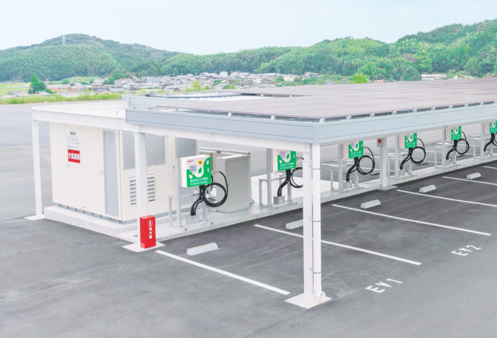 PV Oasis forソーラーカーポートは、PV Oasisにソーラーカーポート、EV充電器を組み合わせたシステムです。太陽光パネルを設置するスペースが無い場合でも駐車場スペースを活用して再生可能エネルギーの導入が可能です。太陽光発電と蓄電池の電力を利用することで、小さい受電容量でもキュービクルの追加設置無しでEVへの急速充電が可能になります。また、災害時(停電時)には防災拠点として非常用電源を供給します。
