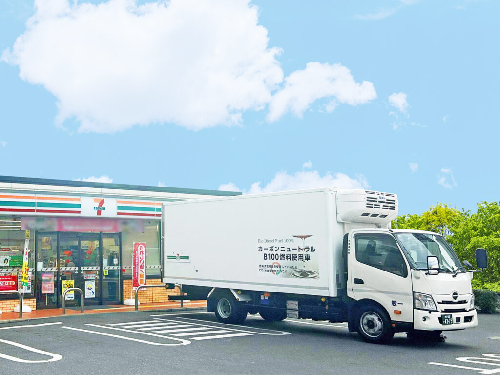 B100燃料仕様トラックでコンビニ配送実証開始【三井物産/セブン-イレブン・ジャパン】軽油との比較で1ℓ当たり1.62kgのCO2排出量削減効果見込む