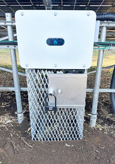 太陽光発電所向け「AIカメラ侵入通報・撃退システム」は、センサーが侵入者を感知すると即時に通知が届き、大音量アラームと赤色灯で威嚇、さらにスピーカー機能で音声撃退も可能だ。無停電バッテリーを内蔵し、メイン電源を切断されても通信できる。