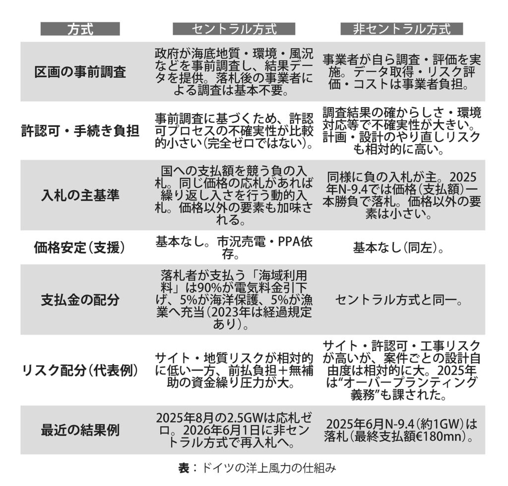 2025年8月1日締切のドイツ洋上風力入札(合計2.5GW)は応札ゼロとなった。規制当局は2026年6月1日に再入札すると公表した。今回の案件は、政府が海底地質や環境影響などの事前調査まで済ませて区画を用意し、事業者は「どれだけ国に支払うか」を競う負の入札(海域利用権の前払方式)であった。落札後の売電は市場で自力販売(支援・価格下支えなし)が前提である。結果として、利用料前払負担の重さと価格変動…