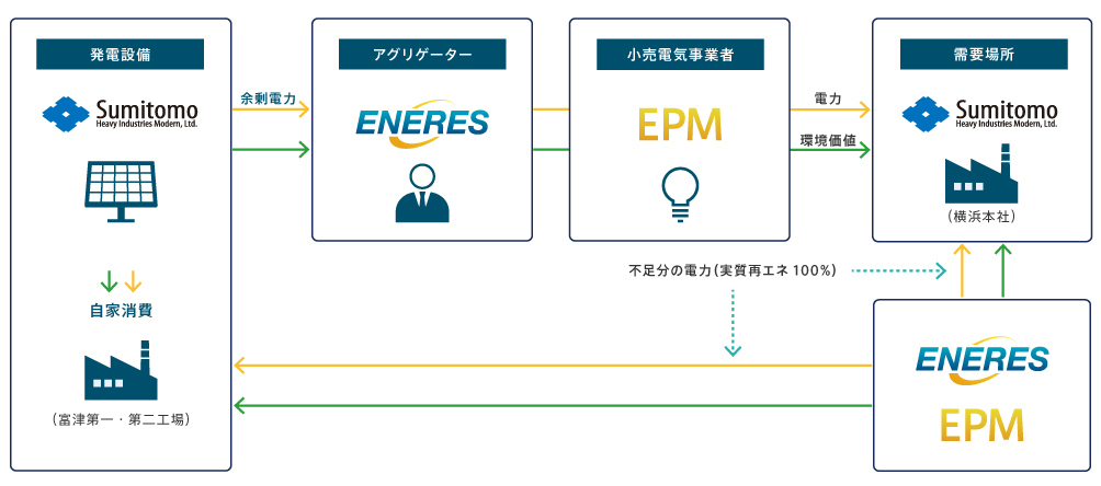 製造機械メーカーの住友重機械モダン(横浜市港北区)と、小売電気事業者のエナリス(東京都千代田区)、エナリスの子会社であるエナリス・パワー・マーケティング(EPM、東京都千代田区)の3社は、オフサイトPPAの運用を11月より開始した。 [画像・上:本件のスキーム(提供:エナリス)] 本PPAで特徴的な点は、自家消費用再エネ電源の余剰分を、自社の他施設へ供給していることだ。一種の「オフサ…