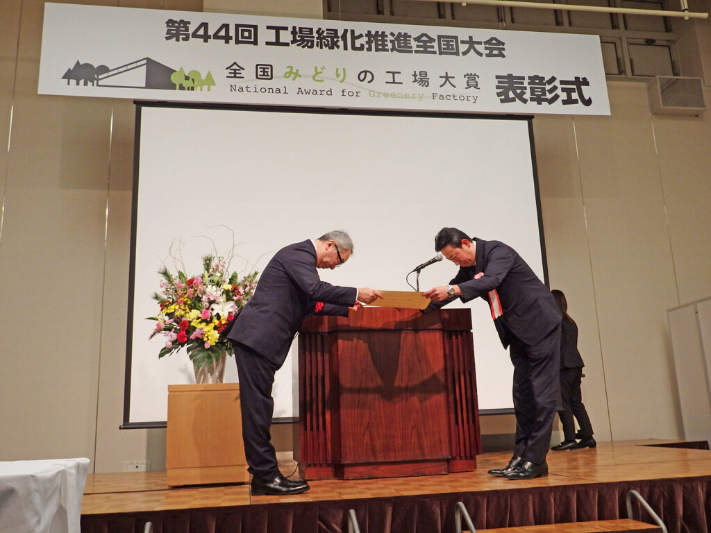 工場・生産拠点の緑化を積極的に推進し、工場内外の環境の向上に顕著な功績のあった工場・法人施設などを表彰する「緑化優良工場等表彰制度」(通称『全国みどりの工場大賞』)。近年の「工場緑化」は、工場での樹木整備や立地自然環境との更なる調和を図るのみならず、企業の脱炭素経営に組み込むことで再エネ・省エネの各取り組みと融合して展開される事例も増えている。 [画像・上:表彰式の様子] アマダ・富…