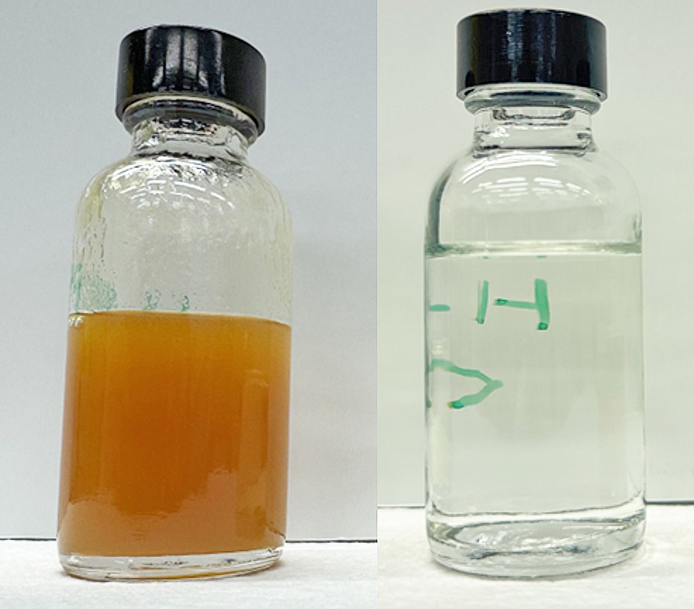 IHIが進めている、CO2と水素から製造される合成燃料のSAF(持続可能な航空燃料)化の技術開発においてこのほど、実物の燃料を試験装置規模で合成することに成功した。合成したSAFは、世界的な航空燃料評価機関である米国ワシントン州立大学において評価を受け、航空機用代替ジェット燃料として良好な特性を有していることが確認されている。 [画像・上:CO2と水素から合成された液体炭化水素(左)と、改…