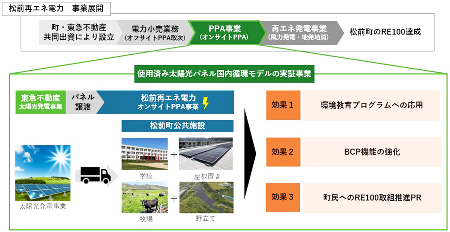 北海道松前町、東急不動産、松前町と東急不動産が2025年4月に共同設立した地域新電力である松前再エネ電力(Mre-ep)は、松前町の町有施設に導入する太陽光発電設備を、リユース太陽光パネル仕様とする国内循環モデルの実証を開始する。 [画像・上:本実証の概要と期待されている効果(提供:東急不動産)] 本実証では、東急不動産が所有する千葉県所在の太陽光発電所から排出される使用済み太陽光パ…