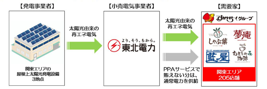飲食店フランチャイズ事業を展開するすかいらーくホールディングス(東京都武蔵野市)は、2050年カーボンニュートラルを目指して再エネ電力採用を進めている。 [画像・上:東北電力とのPPAのスキーム(提供:すかいらーく/東北電力)] このほど、東北電力と新たにオフサイトPPAを締結した。本契約に基づき、すかいらーくグループが運営する関東エリアの205店舗に、関東エリアに立地する屋根上太陽…