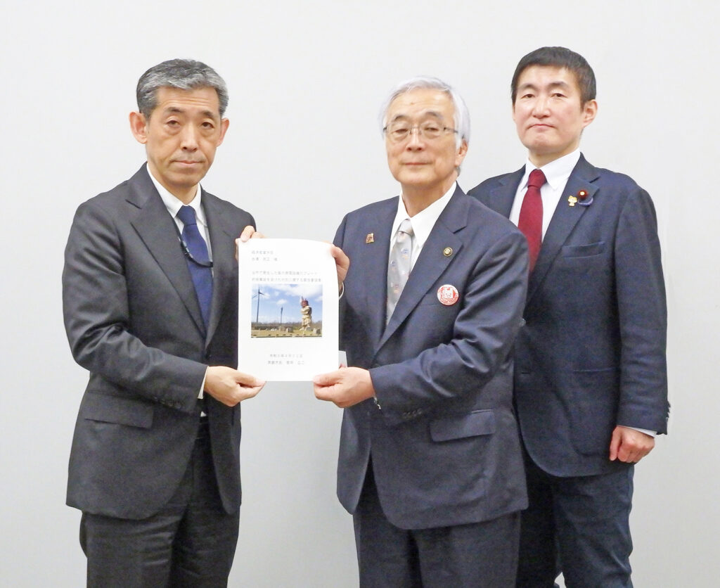 4月、秋田県男鹿市内で、風の王国・男鹿を事業者として運営されている陸上風力発電所「風の王国・男鹿風力発電所」(7,480kW)で、稼働している4基の風車のうち1基のブレードの破損・落下事故が発生した。 [画像・上:市内で発生した風力発電所ブレード折損事故への対応要望書を手渡す、男鹿市長の菅原広二氏(右から2番目)と、受け取る湯本啓市・経産大臣官房技術統括・保安審議官(左)。一番右は同席した…